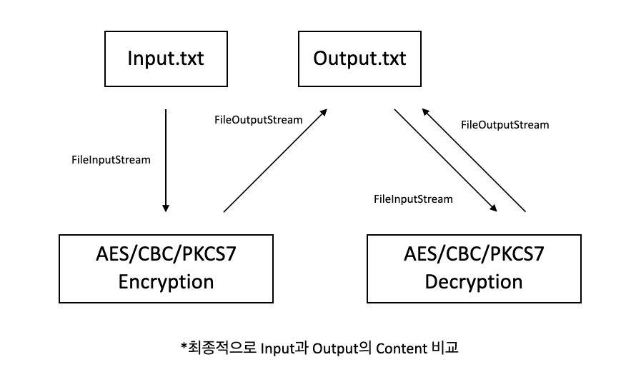 프로그램은 Input의 파일을 FileInputStream을 통해 읽어들이고, Encryption 후에 FileOutputStream으로 Output.txt파일을 만들어줍니다. 이후, 다시 파일을 읽어들여서 Decryption하고 결과값을 기존 PlainText와 동일한지 비교합니다.