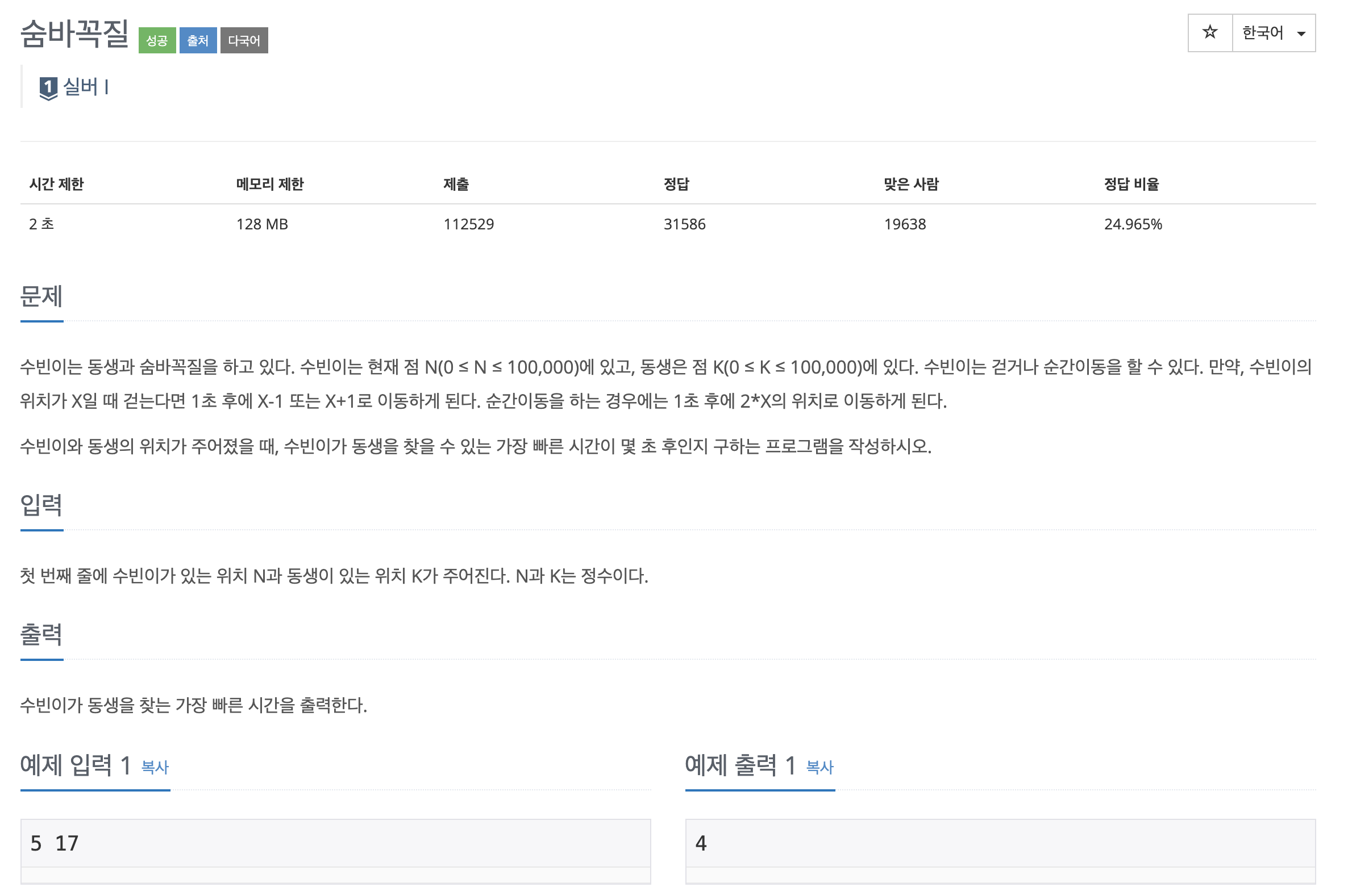 문제는 수빈이와 동생의 위치가 일치되는 지점을 찾고 거기까지 걸리는 최소 시간을 찾는 문제이다.