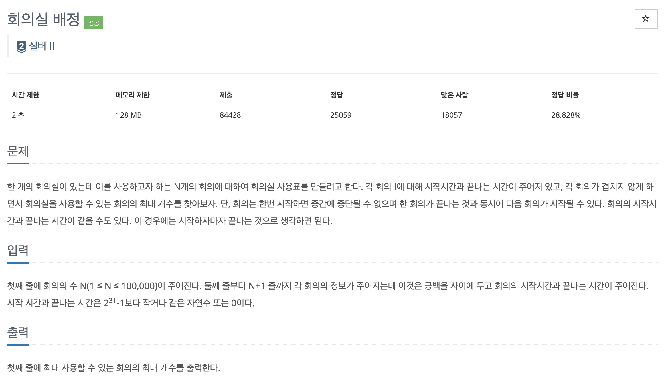 회의실 배정을 적절히 해서 가장 많은 스케줄을 할당하게 하는 문제다. 처음에는 솔루션이 떠오르지 않아, 모든 케이스에 대해서 다음에 올 가장 적절한 스케줄을 찾아나가는 식의 Brute Force를 생각해봤으나, 회의의 수가 최대 100000개이기 때문에 모든 케이스에 대해서 접근하면 O(n^2), 즉, 100000^2의 연산이 필요하다. 따라서, 시간초과가 발생할 여지가 충분했다.