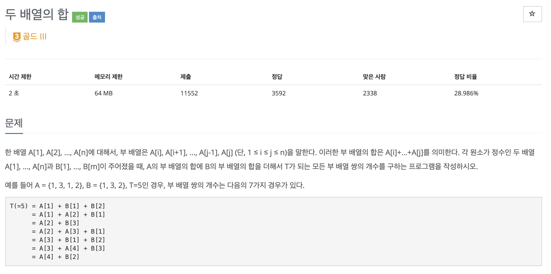 두 배열이 주어지면 각 배열마다 부 배열의 합이 있을 것이고, 특정 부 배열의 합들을 더해서 T를 만족하는 경우의 수를 구하는 문제다. 문제에서 주어졌듯이 부 배열은 각 배열에서 매우 많다. (단, 입력의 조건에 의해 최대 배열의 길이는 1000이므로 배열 당 최대 1000000개까지 나올 것이다) 부 배열은 연속된 배열이라는 특징이 있다.